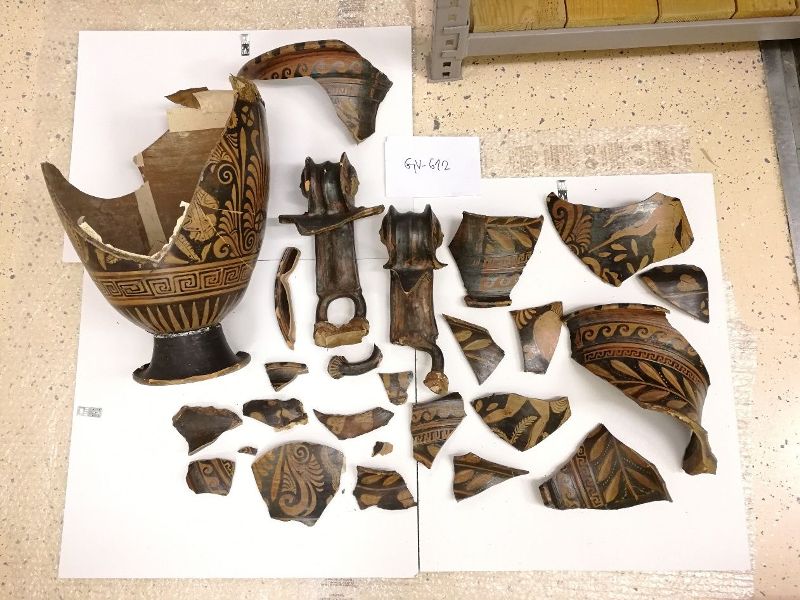 Nažalost, u potresu 22. ožujka 2020. godine oštećeno je 25 posuda. Ovdje bi posebno spomenuli najviše stradali predmet, volutni krater, koji se ističe svojom veličinom (visina 70 cm), ali i vrlo lijepo izvedenim ukrasima u tehnici crvenofiguralnog stila. Krater je naziv za posudu većih dimenzija, sa širokim otvorom i dvije drške, a koristio se za miješanje vina i vode na gozbama. Prema obliku drške, ovdje spomenuti krater naziva se „volutni“. Cijela vanjska površina posude je ukrašena: na obodu naizmjenično širokim crnim i bijelim trakama, ispod ruba motivom pasjeg skoka i meandrom, vijencem od mirte na vratu posude, a na ramenima je bršljanova vitica s listovima. U donjem dijelu posude široki je pojas s meandrom, a na prijelazu k nozi zrakasti motiv. Drške su ukrašene motivom pasjeg skoka, a na volutama reljefnim glavama Gorgone. Prostor ispod drški ispunjen je spletom palmeta, cvjetova, voluta i listova.