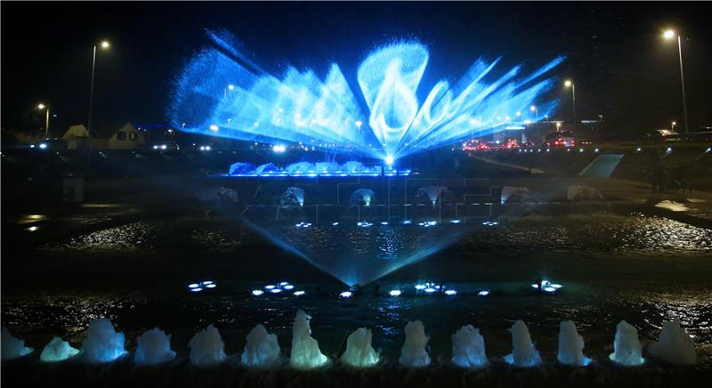 Božićna čestitka na fontanama pored Nacionalne i sveučilišne knjižnice u Zagrebu.