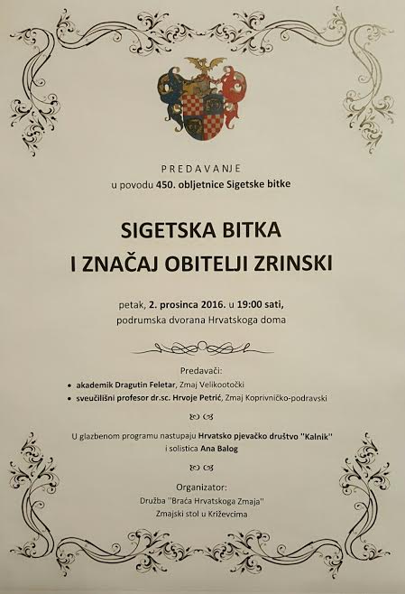 Družba ” Braća Hrvatskog zmaja” Zmajski stol u Križevcima povodom 450. obljetnice Sigetske bitke organiziraju predavanje pod nazivom “Sigetska bitka i značaj obitelji Zrinski”. Predavanje će u podrumskoj dvorani Hrvatskoga doma u petak, 2.prosinca u 19 sati održati akademik Dragutin Feletar i sveučilišni profesor dr.sc. Hrvoje Petrić. U glazbenom programu nastupit će Hrvatsko pjevačko društvo “Kalnik” i solistica Ana Balog.