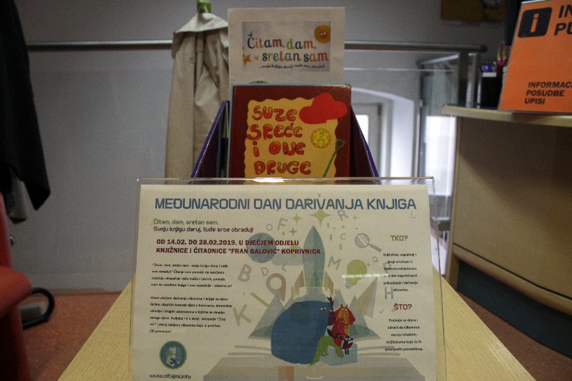 Knjižnica Fran Galović iz Koprivnice provodi akciju “Čitam, dam, sretan sam. Svoju knjigu daruj, tuđe srce obraduj!”. Akcija je krenula na Međunarodnog dana darivanja knjiga koji se obilježava 14. veljače, a traje sve do kraja mjeseca . Akcija se provodi na dječjem odjelu, a cilj akcije je prikupljanje slikovnica koje će vrijedni knjižničari dalje proslijediti.