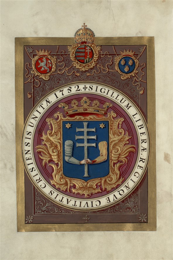 Grb Gornjeg grada razlikuje se utoliko što ovdje ruka odjevena u rukav obične odjeće drži latinski križ sa jednom antenom. Razumljivo je da s pečatnjaka ne možemo zaključiti koje je boje bila podloga i ostali detalji, ukoliko je to pitanje uopće bilo na ikakav način utvrđeno. Natpis na pečatnjaku, ispisan u kraticama, očitavamo: ‘Sigillum novae regiae superioris civitatis Crisiensis’.