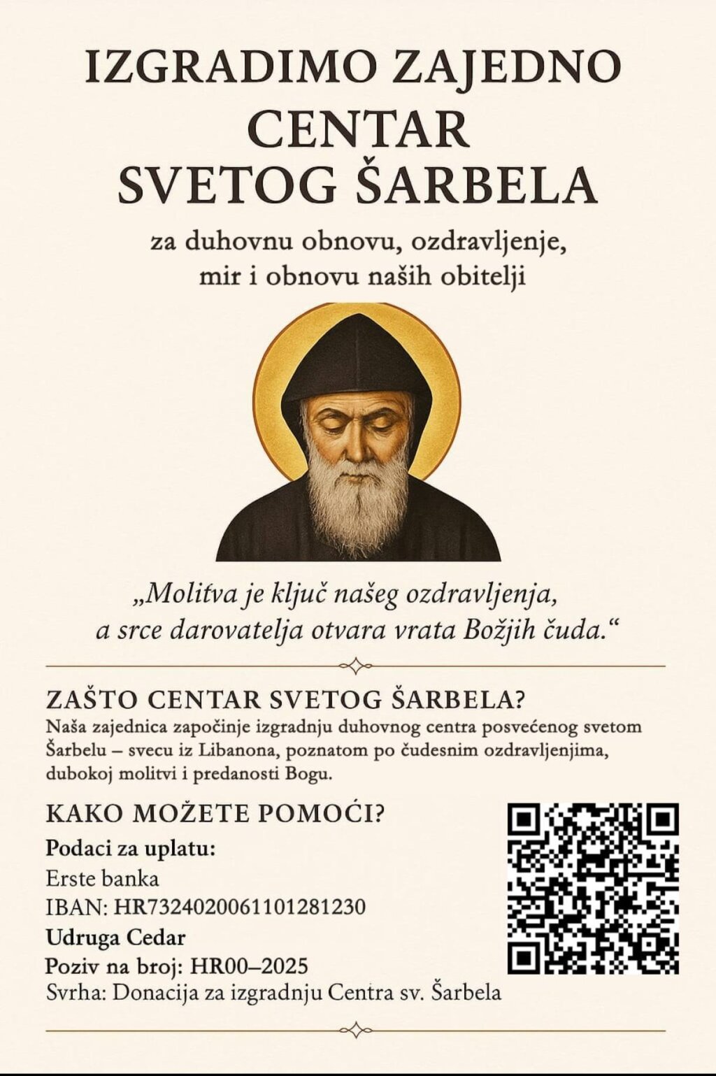 Pratite našu Facebook stranicu na kojoj ćemo vas obavještavati o izgradnji Centra sv. Šarbela u Križevcima! Hvala ti što pomažeš graditi dom svetosti, mira i zajedništva”, poručuju iz Molitvene zajednice sv. Šarbela.