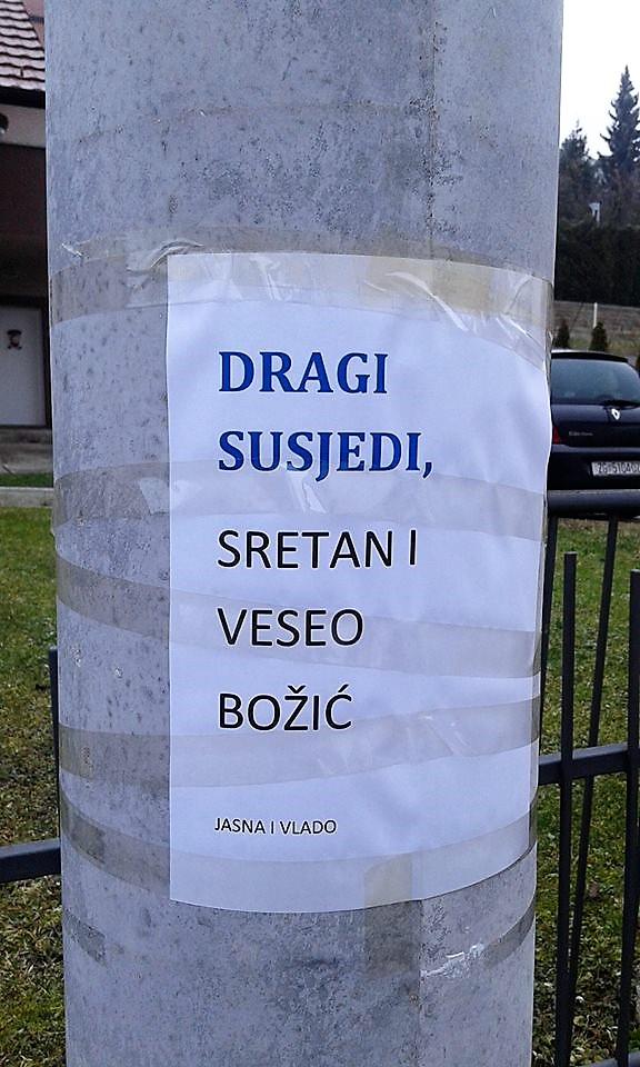 Vrijeme je božićnih i novogodišnjih blagdana, a čestitke na razne načine dolaze do poznanika, prijatelja i rodbine. Facebook i sms čestitke i dalje su najčešći oblik čestitanja, a čestitke koje donosi poštar lagano padaju u zaborav. Jedna od najzanimljivijih čestitki viđena je na Badnjak u zagrebačkom mjestu Gračani, a čestitku je na stup zalijepio Križevčanin Vladimir Lovreković.