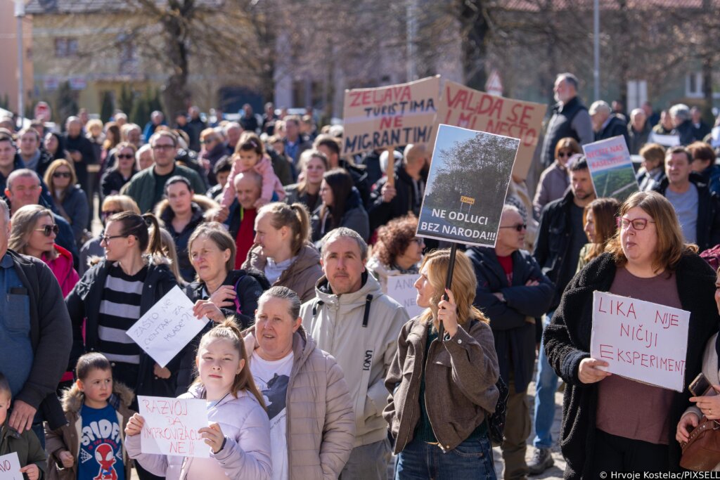 Nekoliko stotina građana prosvjedovalo je u nedjelju u organizaciji Općine Plitvička Jezera protiv namjere da se na području bivšeg vojnog aerodroma Željava uspostavi centar za migrante.