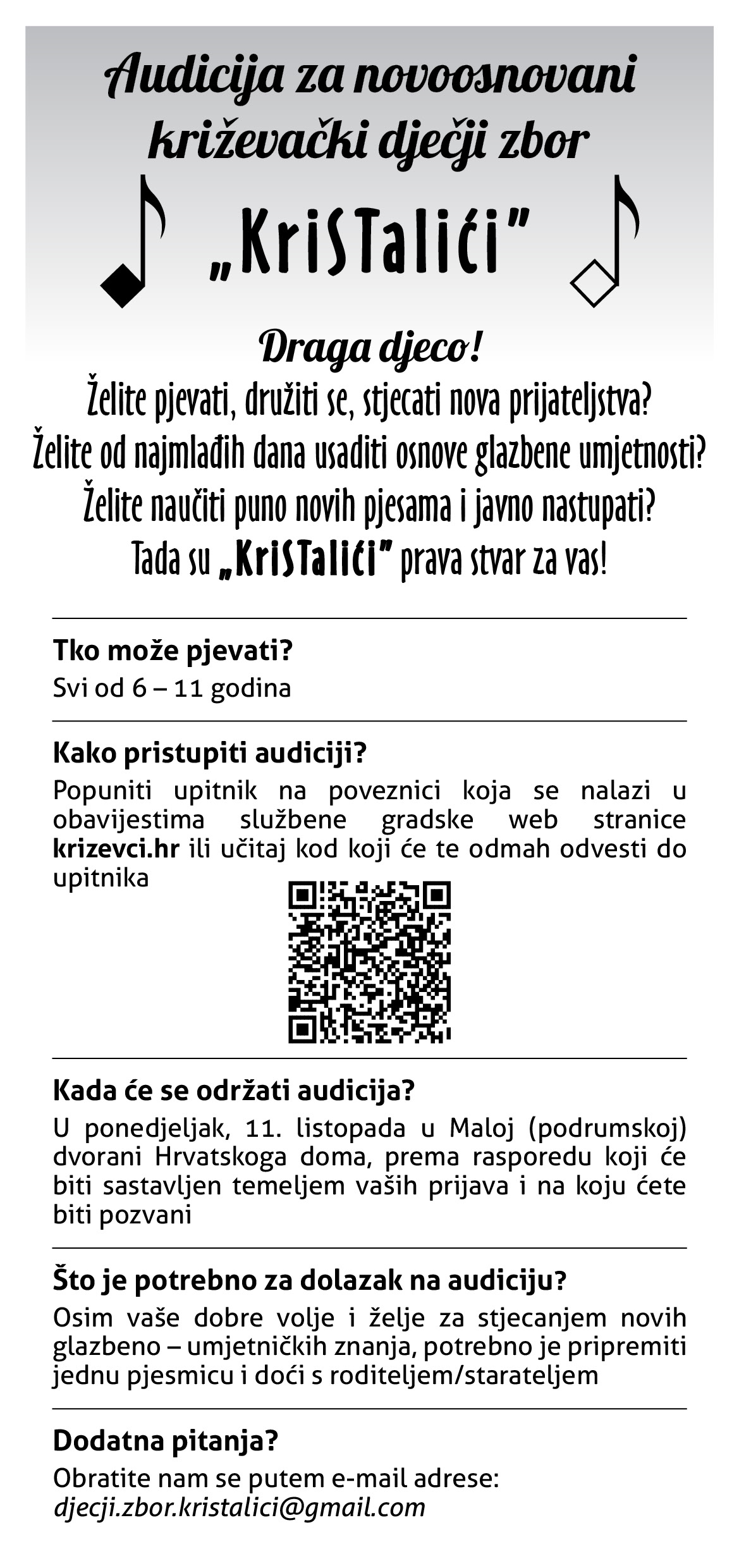 Prijavu za audiciju moguće je popuniti putem poveznice OVDJE ili učitavanja koda koji je na slici ove objave, a na kojoj pišu i druge važne obavijesti.
