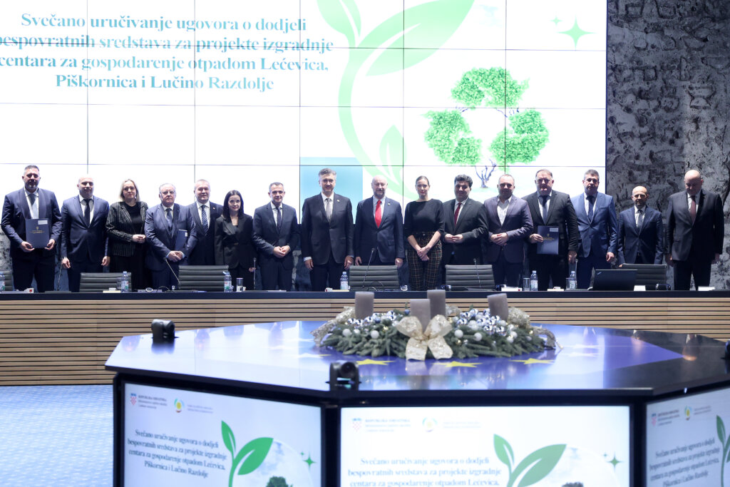 Premijer Andrej Plenković uručio je ugovore za izgradnju tri centra za gospodarenje otpadom (CGO) Lećevica, Piškornica i Lučino razdolje koji će preuzeti ono što neadekvatna aktualna odlagališta otpada trenutno rade, te odluke o financiranju iz Poziva IRI S3 za projekte istraživanja i razvoja.