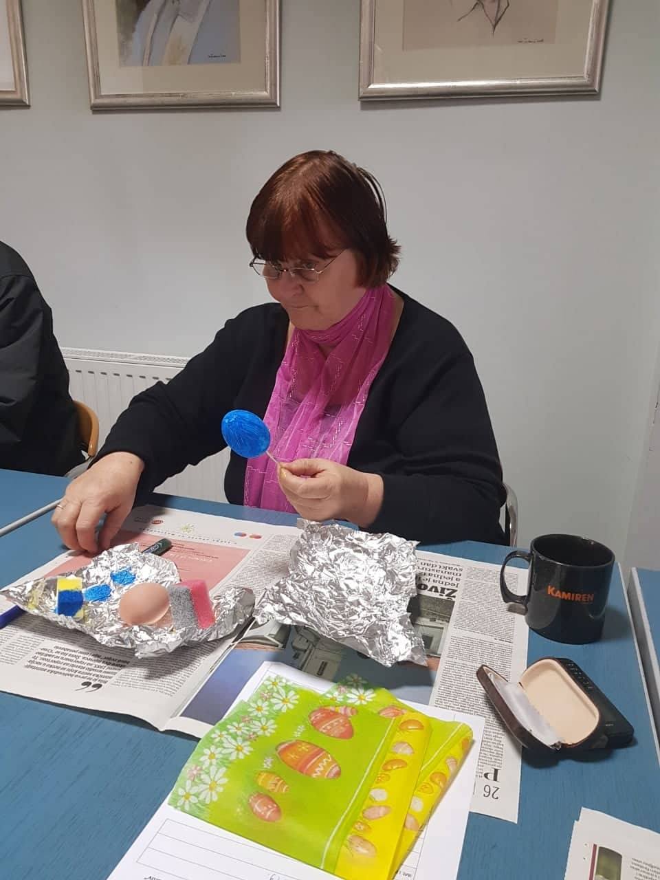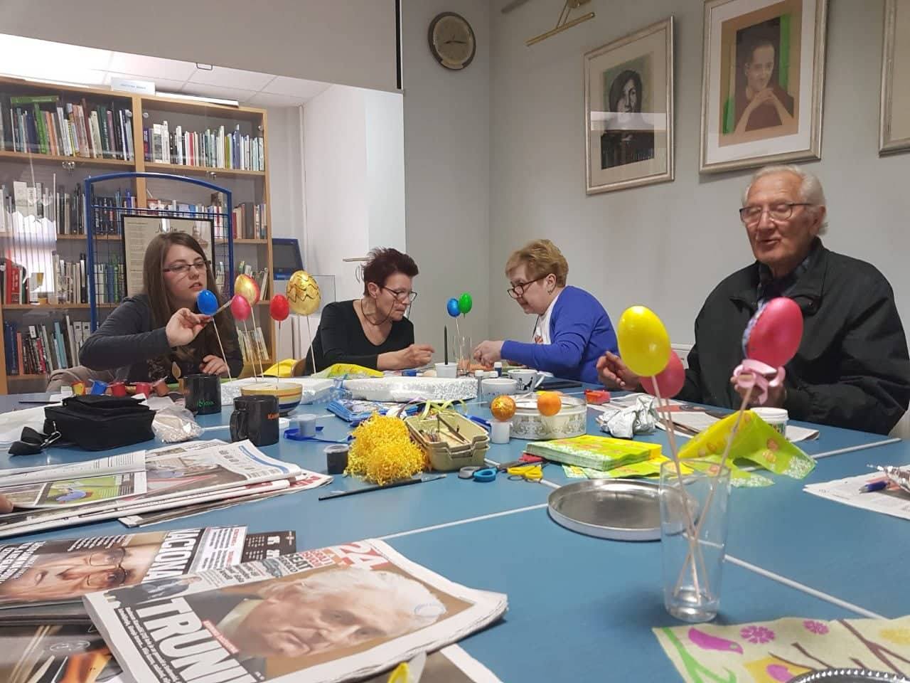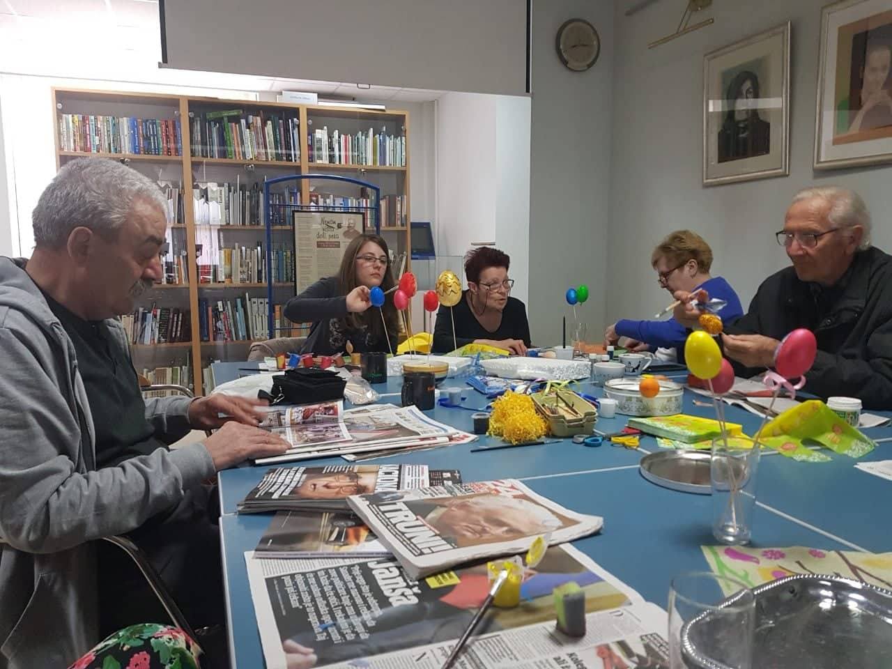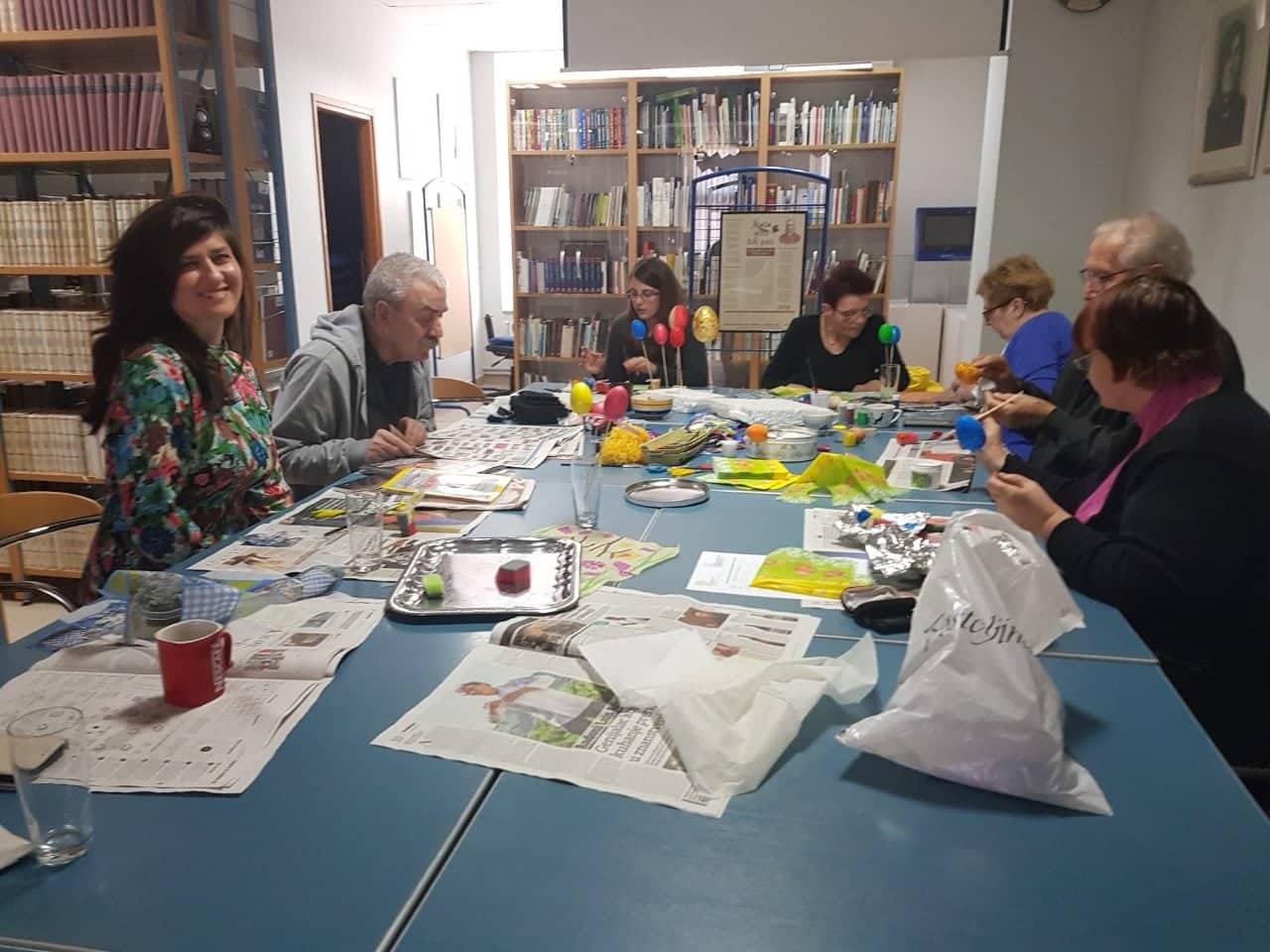 Povodom nadolazećeg blagdana Uskrsa, u četvrtak 21. ožujka održana je radionica ukrašavanja pisanica, a koju je vodila knjižničarka Sanja Lacković. Članovi Društva pisanice su ukrašavali decoupage tehnikom (salvetnom tehnikom) koja je unazad nekoliko godina postala vrlo popularan, jednostavan i efektan način dekoracije uskršnjih pisanica, a za koju su potrebni jaja, kist, salvete različitih motiva, ljepilo ili bjelanjak.