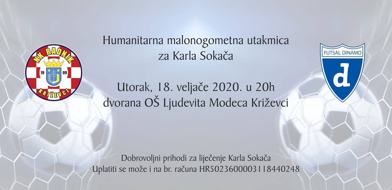 U križevačkom sportskom domu sutra u 20 sati odigrat će se humanitarna malonogometna utakmica za Karla Sokača, vratara NK Radnik Križevci koji je na Silvestrovo teško ozlijeđen u prometnoj nesreći i nalazi se na rehabilitaciji u bolnici u Varaždinskim Toplicama.