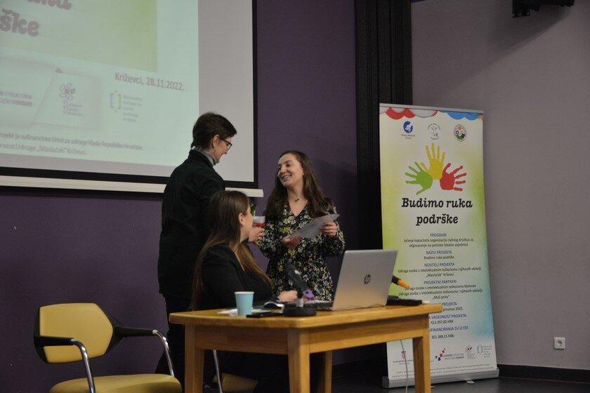 Na završenoj konferenciji predstavljeni su ostvareni rezultati i aktivnosti projekta. Predsjednica udruge Maslačak, Tamara Premuš, zahvalila je svima na dolasku i otvorila predstavljanje rezultata projekta “Budimo ruka podrške”.