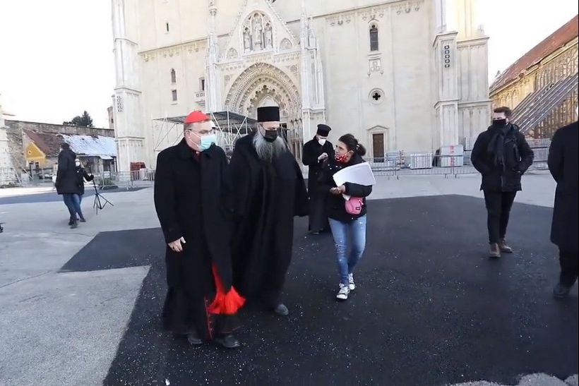 Nakon obilaska zagrebačke katedrale u kojoj su se kardinal Josip Bozanić i mitropolit Porfirijezajednički pomolili pred katedralom ih je dočekala prosjakinja.